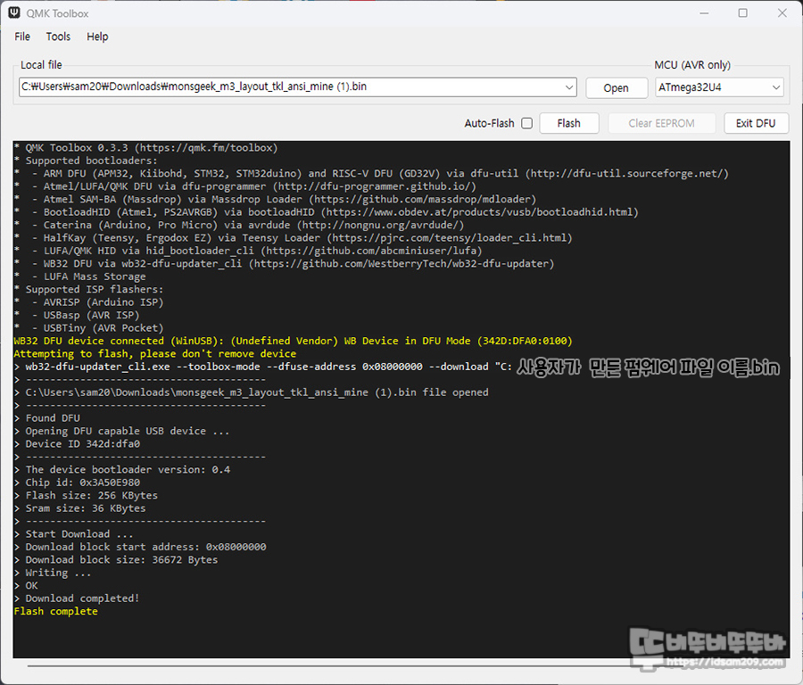 작업이 완료되면 Flash complete 표시가 뜨면서 작업이 완료되며 펌웨어 이후에는 USB 케이블 연결을 해제 후 다시 연결하시면 사용이 가능합니다.