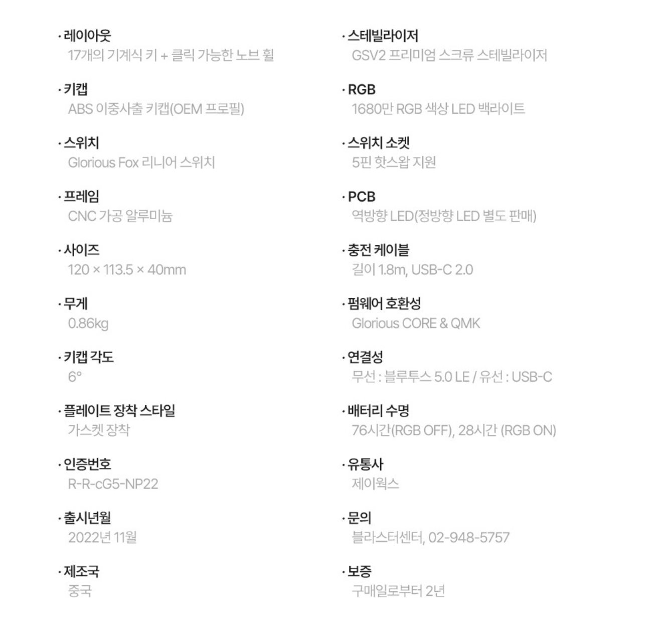 프로그래밍이 가능한 18개 키 (노브포함), 글로리어스 폭스 (리니어- 팩토리 윤활) 스위치, CNC 가공 알루미늄, 가스켓 방식, 블루투스 / 유선 지원, LED Off 시 최대 76시간 사용 등의 내용을 확인할 수 있고요.