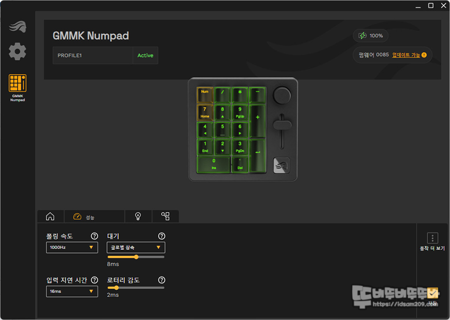 성능 메뉴에서는 USB 폴링 레이트, 입력 지연 시간, 대기, 로터리 감도 등을 선택이 가능하네요.