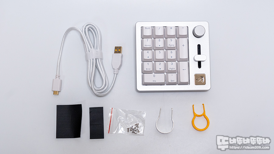 제품은 키패드 본체 (Fox 리니어 스위치와 PBT 키캡 포함), 1.83m USB 케이블, 스위치 리무버, 키캡 리무버, 14개 추가 나사, 여분의 가스켓 스펀지 그 외 스티커와 각종 안내서로 구성되어 있습니다.