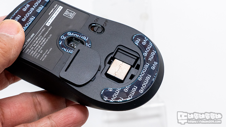 바닥면에는 무선 리시버 페어링 버튼과 전원 On/Off 스위치 그리고 무선 리시버를 수납하는 공간이 마우스 휴대 시 무선 리시버를 따로 가지고 다니지 않고 마우스에 수납하여 이동할 수 있습니다.