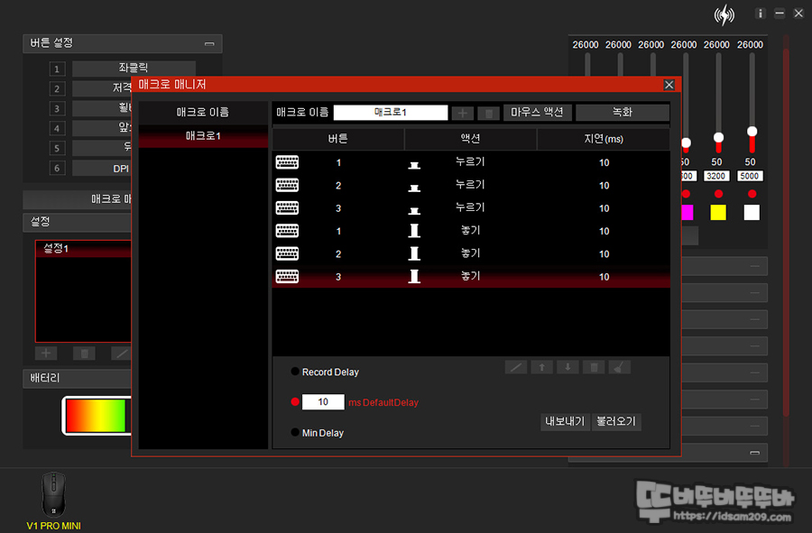 매크로 기능 또한 기존의 마우스에 많이 접하는 매크로 기능으로 파일 이름 설정 - 녹화 버튼 - 키 입력 - 녹화 정지로 순으로 기록하게 됩니다.