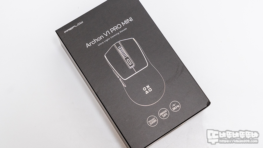 프리플로우 archon V1 PRO MINI 무선 8K 마우스는 검정색 무지 패키지에 제품의 아우트라인과 3395센서 사용 26000DPI 지원 그리고 8kHz 무선을 강조하고 있고요.