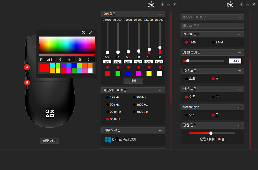 컬러 박스를 선택하면 DPI 컬러 변경이 가능하며 빨간색 원을 선택하면 On/Off 형태로 DPI 단계를 조절할 수 있습니다.