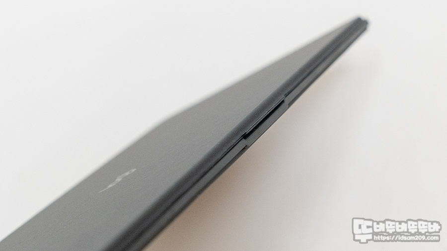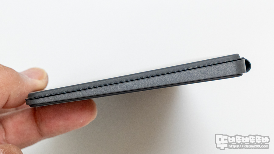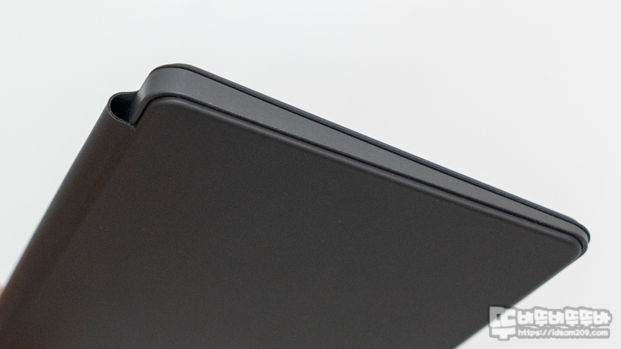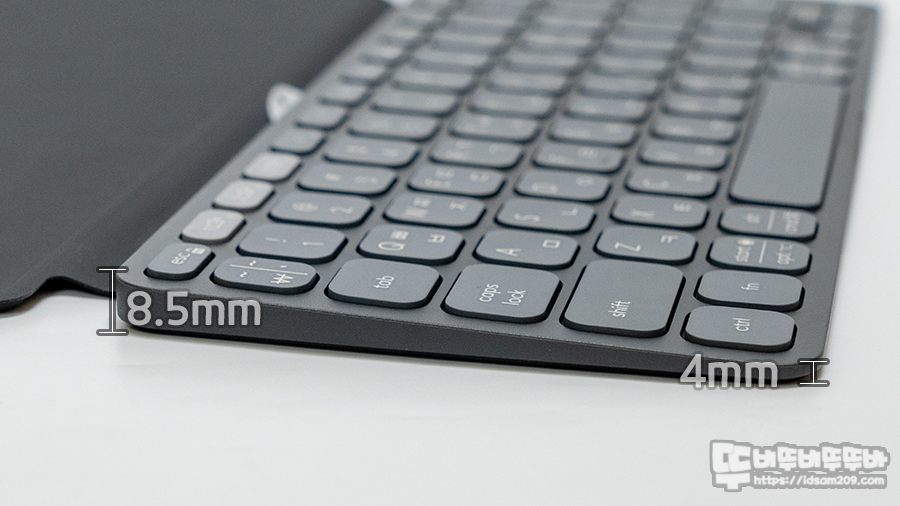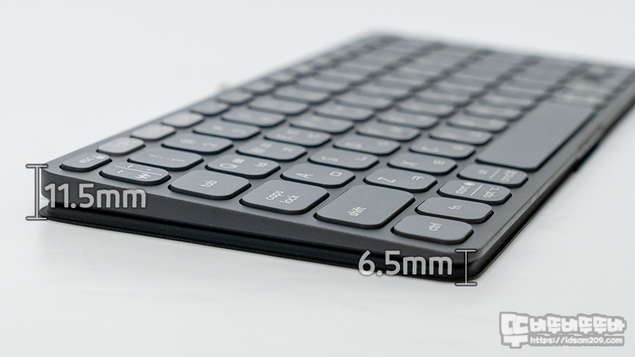 키보드 자체 높이를 실측으로 확인해 보면 약 8.5mm / 4mm 커버를 뒤로 넘겨 받침대로 사용 시 약 11.5mm / 6.5mm로 소폭 상승하며 타이핑에 최적화된 높이를 만들어줍니다.