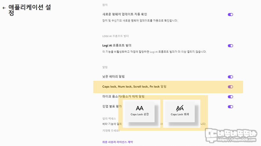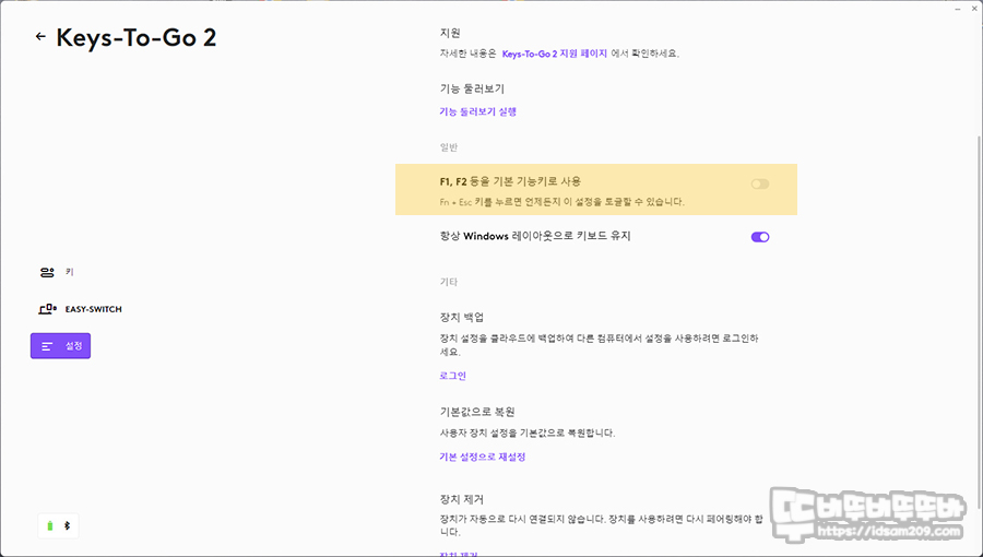 마지막으로 설정 메뉴에서 Fn+Esc 기능 소프트웨어도 선택이 가능하며 윈도우즈와 Mac OS에 한정된 소프트웨어지만 사용하지 않더라도 키보드 기능을 사용하는데 어려움이 없습니다.