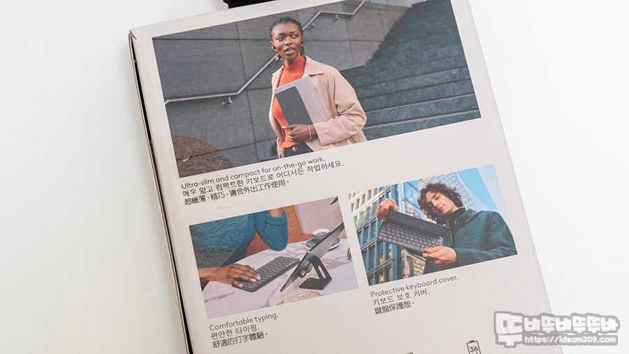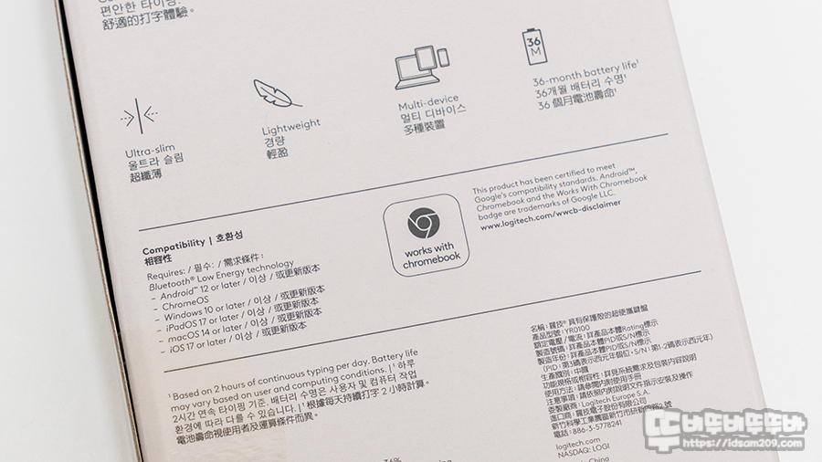 컴팩트한 디자인으로 휴대 가능 / 편안한 타이핑 / 키보드 보호 커버 일체형 / 울트라 슬림 두께 / 경량 무게 / 멀티 디바이스 지원 / 최대 36개월 사용 (하루 2시간 사용 기준) / 다양한 OS 지원이 인쇄되어 있습니다.