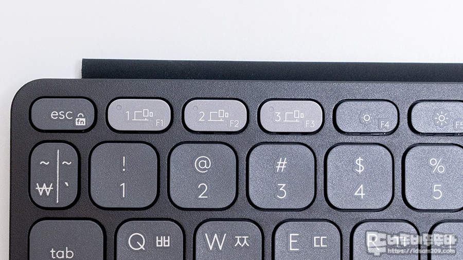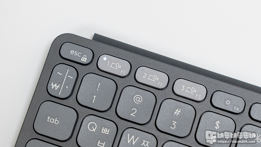 F1, F2, F3키에 다양한 디바이스를 연결 및 빠르게 전환이 가능한 멀티 페어링 기능으로 키보드 하나를 다양한 기기에 무선으로 연결하여 사용이 가능한데 최초 페어링 시 화이트 LED가 점멸하지만 페어링 이후에는 기기 전환 시 연결 상태에 따라 점등 (빠르게 전환) 점멸 (잠긴 기기가 깨어날 때까지)로 표현되어 키를 누르고 진행되는 과정은 눈으로 확인할 수 있고요.