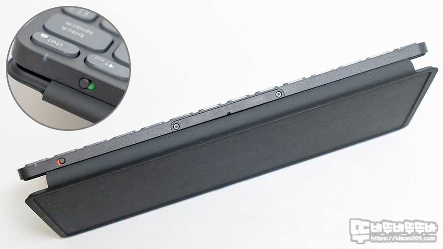 키보드 상단에는 레드(Off)/그린(On) 컬러로 구분되는 전원 스위치, 배터리 잔량을 표현해 주는 LED 인디케이터 그리고 중앙에는 CR2032 배터리를 수납하는 트레이를 확인할 수 있는데요.