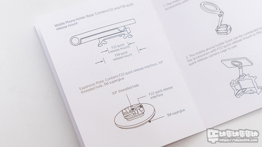 퀵 릴리즈의 경우 팔캠 제품 중 F22 , F23 마운트에 사용이 가능 그리고 4방향으로 사용 가능한 퀵 릴리즈 모습에서는 1/4 볼드 사용 가능한 홀더 그리고 강력한 3M 테이프 적용을 안내하고 있습니다.
