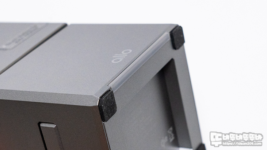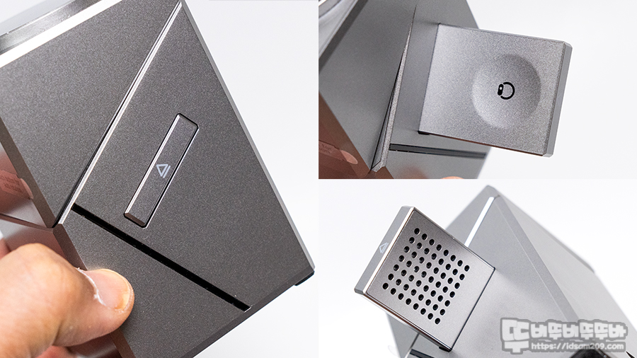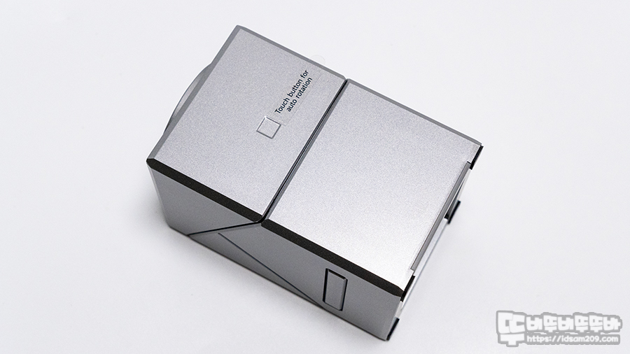 전면에서 보면 이층 디자인으로 보이지만 상단부는 회전이 되는 형태로 전면에 터치센서가 내장되어 센서 위치를 조그만 사각형으로 구분해 주고 있습니다.