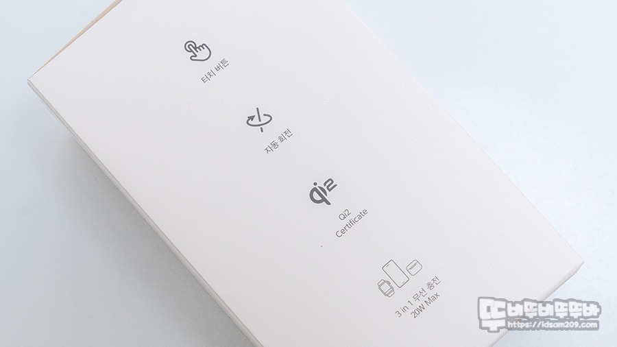 패키지 측면에는 제품의 특징인 터치 버튼, 자동 회전, Qi2 인증, 3 in 1 무선 충전 최대 20W Max 지원을 강조하고 있고요.