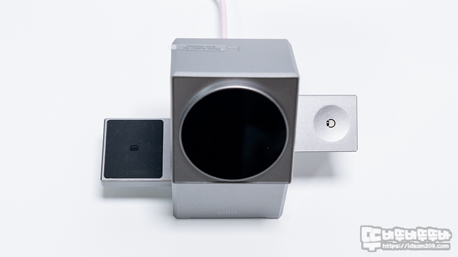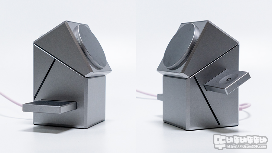 사각 큐브 형태의 디자인에 좌우에 에어팟, 워치 충전이 가능한 충전 부를 수납하고 있으며 전면 부의 터치 센서를 터치해 주면 180도 회전을 하여 맥세이프 충전 부를 Face ID 사용에 최적화된 각도를 만들어 주는 게 특징입니다.