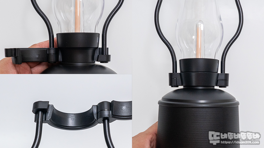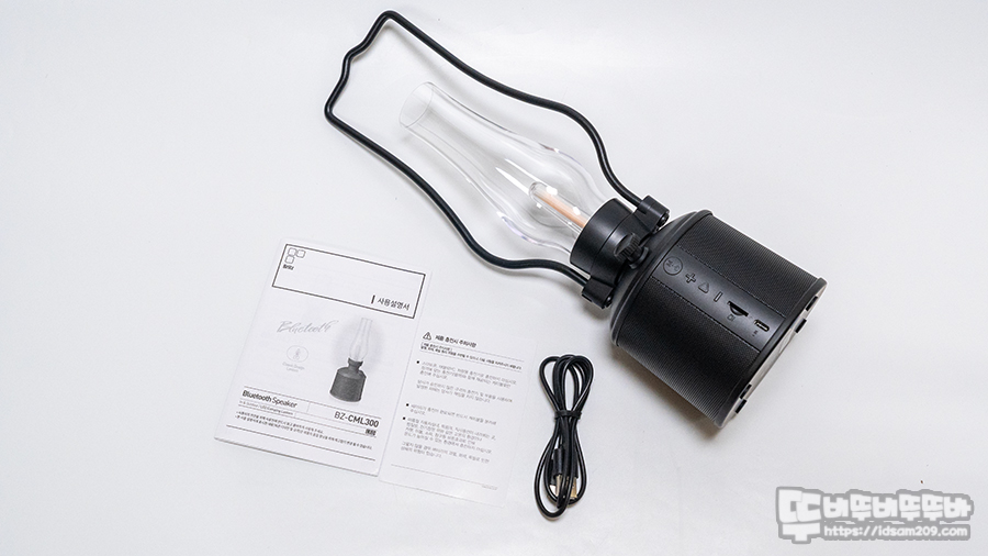 제품은 LED가 포함된 블루투스 스피커 본체, 유리가 아닌 플라스틱으로 디자인된 램프 투명 커버, 램프 걸이(손잡이)로 구성되어 있고요.