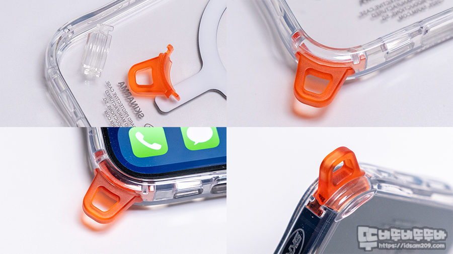 필자가 보는 관점에서 스키나마 사이도 아이폰 16 PRO 맥세이프 케이스의 강점은 케이스 모서리에 랜야드 후크를 장착할 수 있는 부분과 포인트 컬러 버튼을 제공하여 취향에 따라 교체가 가능한 부분입니다.