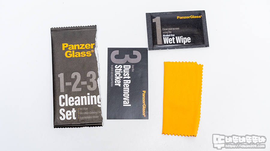 클리닝 세트 패키지는 알코올 페이퍼와 먼지 제거 스티커 그리고 극세사 융으로 구성되어 필름 부착 시 편리함을 제공합니다.