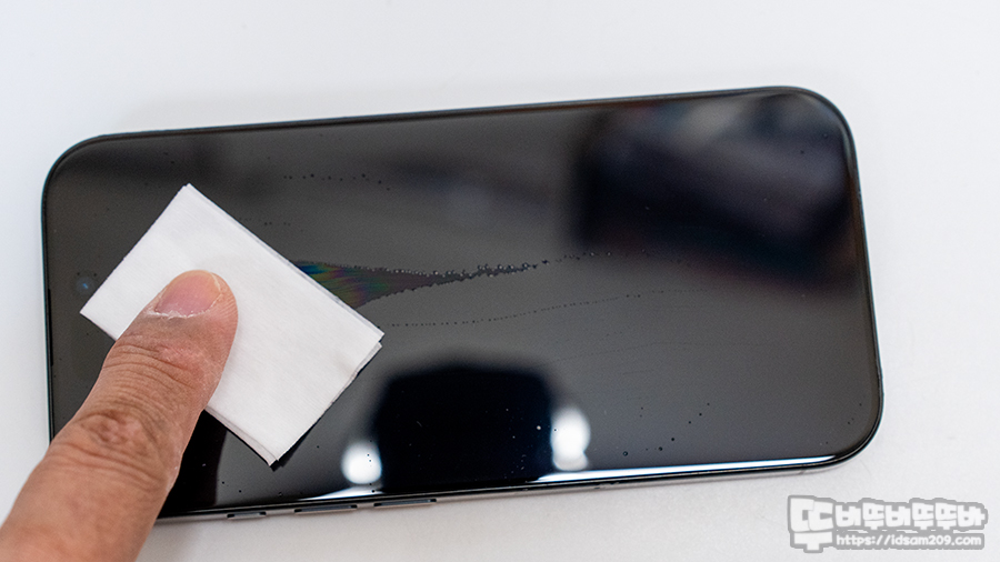 먼저 알코올 페이퍼를 이용하여 아이폰 전면을 클리닝해줍니다.