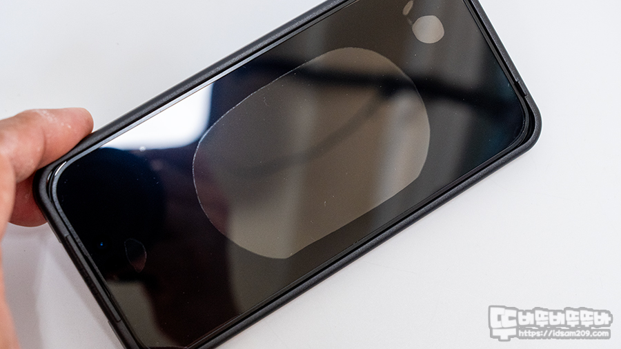 강화유리 필름 뒤쪽에 보호 필름을 제거 후 아이폰 장착 가이드 끝부분에 사선으로 넣은 후 빠르게 위쪽까지 부착해 줍니다.