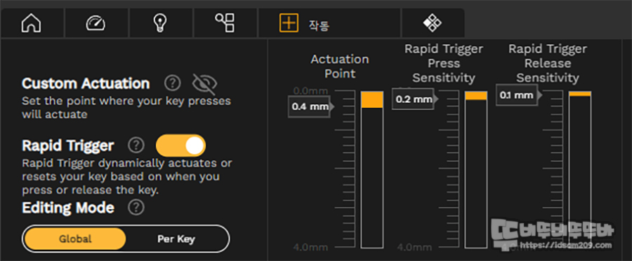 가장 핵심 기능이라 할 수 있는 작동 메뉴에는 키 입력 지점 설정과 입력 지점과 해제 지점을 빠르게 선택할 수 있는 래피드 트리거 기능을 활성화할 수 있는데 개별 키 지정과 전체 키 지정(글로벌)으로 구성되어 있으니 편리한 쪽으로 사용하시면 좋습니다.