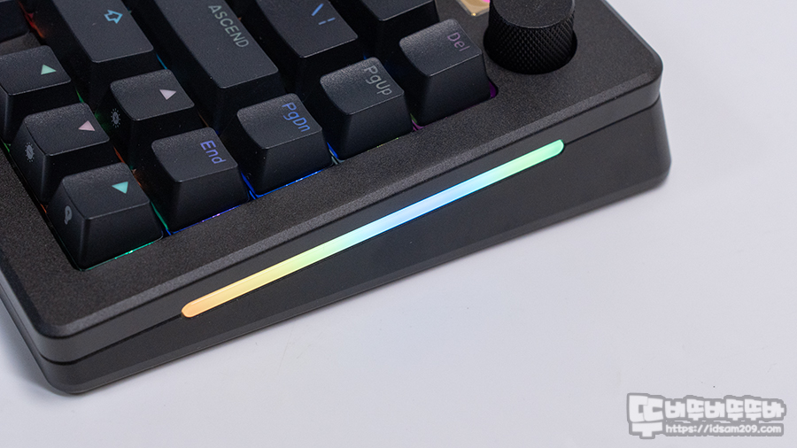 양쪽 측면에 LED 라이팅 바가 적용되어 LED 효과 표현 시 자판부의 효과 동일하게 또는 사이드만 선택하여 표현이 가능하며 Caps Lock 키를 사용하는 경우 LED 라이팅 바가 점멸하면서 기능을 사용하고 있음을 시각적으로 확인이 가능합니다.