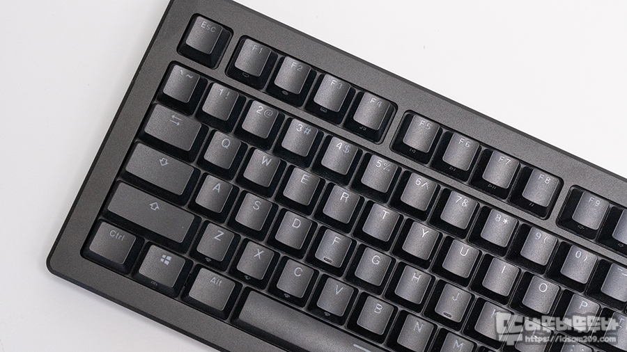 이색 사출이 적용된 PBT 키캡은 각인 부분인 반투명 소재가 적용되어 LED 빛 투과에 특화되었으며 Fn 조합으로 사용되는 키는 측각 실크인쇄로 표현하고 있습니다.