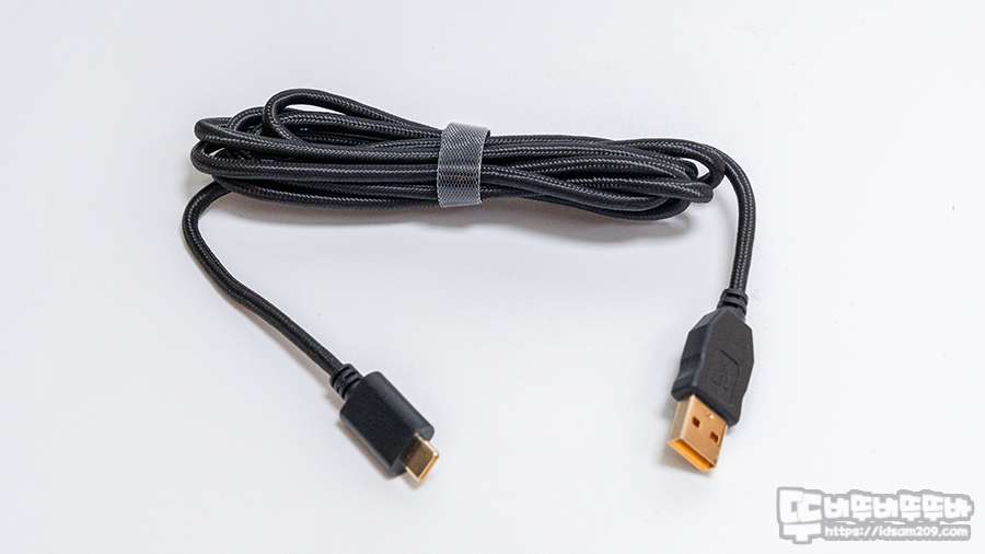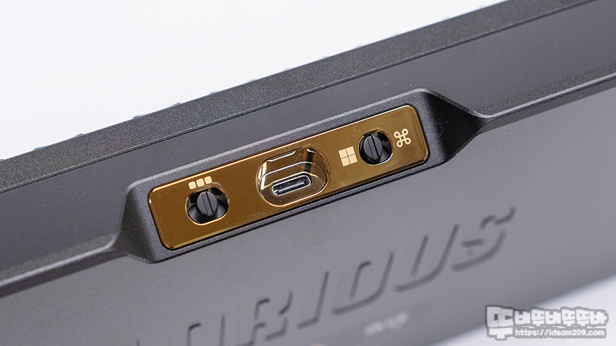 골드 컬러 메탈 소재가 사용된 케이블 연결 부는 포인트 느낌을 주며 유선 모델이기에 왼쪽에는 프로파일 1, 2, 3 선택 스위치와 USB-C 연결 단자 그리고 Windows OS / Mac OS 선택 스위치로 구성되어 있고요.