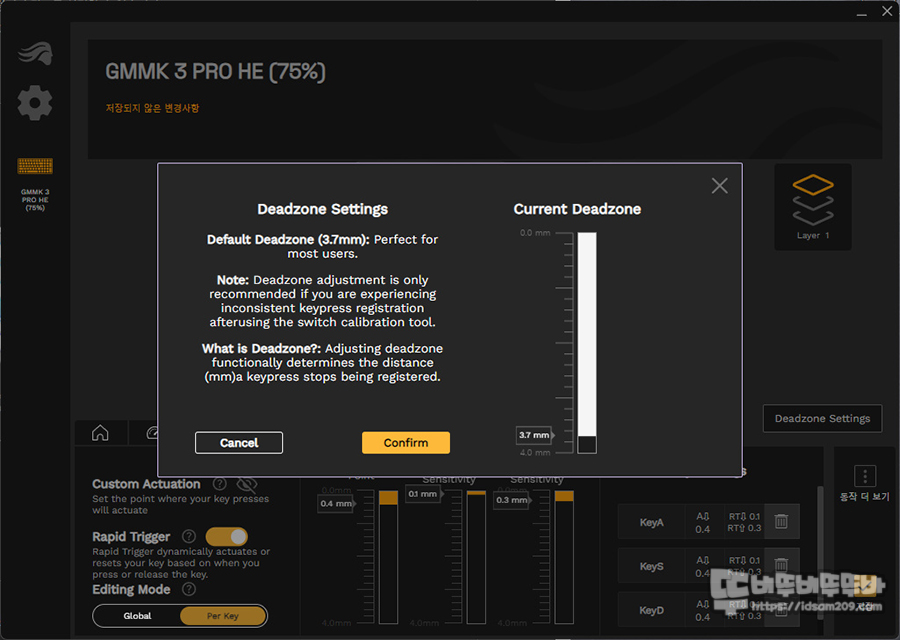 오른쪽에 데드존 설정 메뉴를 누르면 설정된 높이 이하에서 작동하는 않는 리미트를 설정하는 기능으로 제조사에서는 3.7mm가 유저들에게 최적화된 값이라 설명하니 참고하시기 바랍니다.