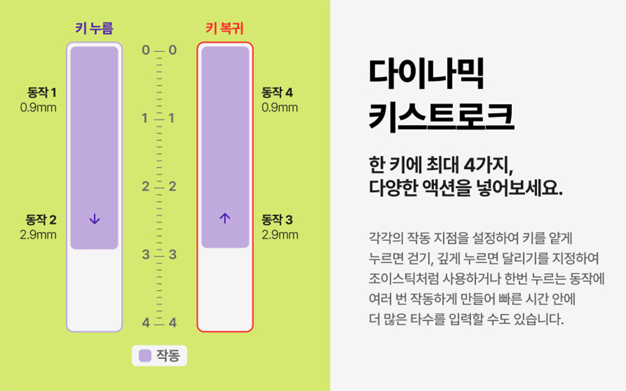 또한 1개 키에 누르고 올라오는 키 입력에 4가지 기능을 부여할 수 있는 다이나믹 키스트로크 기능을 지원하여 누를 때 1, 2 해제할 때 3, 4를 설정하며 설정된 키를 누르고 해제하는 동작으로 1,2,3,4를 입력할 수 있습니다.