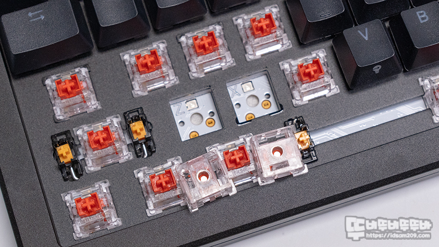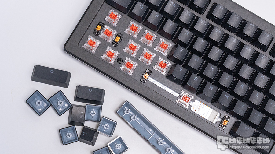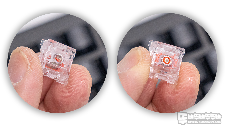 스위치가 역방향 방식에 스위치 뚜껑 부분에 기판에 SMD 타입으로 부착된 LED 빛을 확산하는 방식으로 LED 라이팅이 밝게 보이는 효과를 연출합니다.