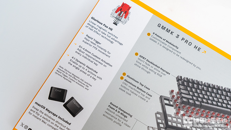 홀 이펙트(HE)를 지원하는 글로리어스 Fox HE 스위치 적용으로 래피드 트리거 지원, 0.1~4.0mm 입력 지점 지정, 한 개 키에 4가지 액션 적용이 가능한 다이나믹 키 스트로크 그리고 Mac OS 키캡 동봉.