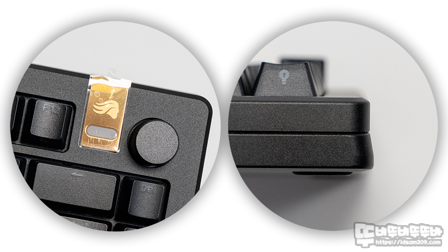 이색 사출이 적용된 PBT 키캡은 각인 부분인 반투명 소재가 적용되어 LED 빛 투과에 특화되었으며 Fn 조합으로 사용되는 키는 측각 실크인쇄로 표현하고 있습니다.