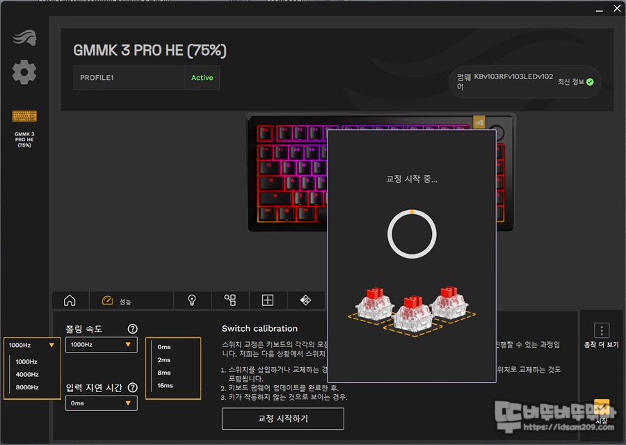 먼저 성능 메뉴입니다. 기본적으로 폴링 레이트와 입력 지연시간 설정과 스위치 캘리브레이션 기능을 지원하며 스위치에 이상 또는 교체 시 설정해 주시면 좋습니다.