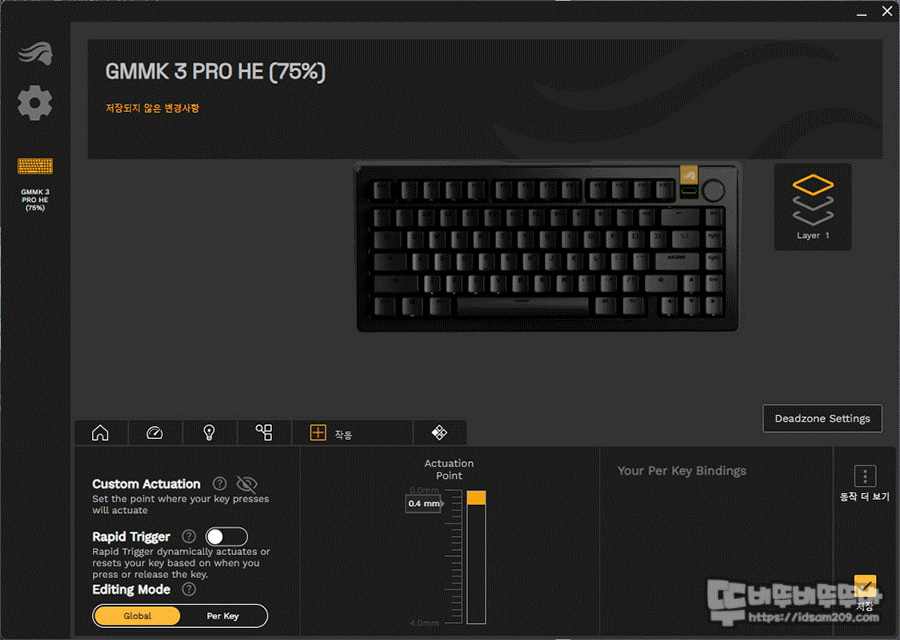 가장 핵심 기능이라 할 수 있는 작동 메뉴에는 키 입력 지점 설정과 입력 지점과 해제 지점을 빠르게 선택할 수 있는 래피드 트리거 기능을 활성화할 수 있는데 개별 키 지정과 전체 키 지정(글로벌)으로 구성되어 있으니 편리한 쪽으로 사용하시면 좋습니다.