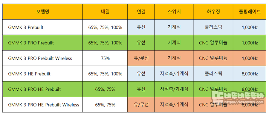 위 구성은 조립 형태로 판매되는 Prebuilt 기준으로 보면 가장 보편적인 일반 라인업(GMMK 3, GMMK 3 HE)과, 프로 라인업( GMMK 3 Pro, GMMK 3 HE Pro) 그리고 최고급 라인업이라 할 수 있는 무선 모델으로 구분할 수 있는데요.