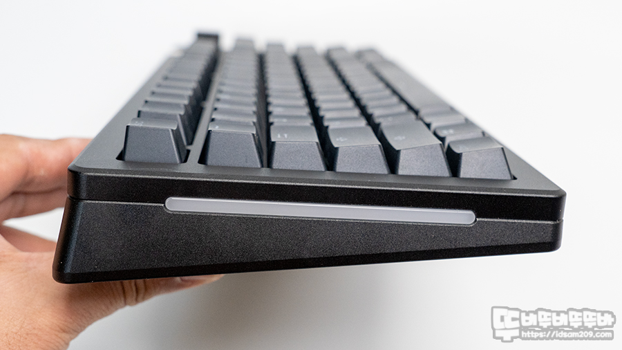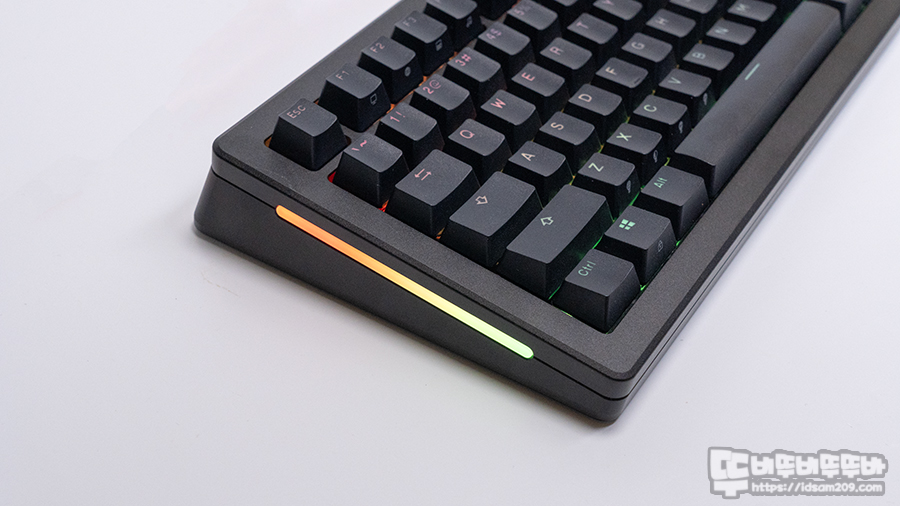 양쪽 측면에 LED 라이팅 바가 적용되어 LED 효과 표현 시 자판부의 효과 동일하게 또는 사이드만 선택하여 표현이 가능하며 Caps Lock 키를 사용하는 경우 LED 라이팅 바가 점멸하면서 기능을 사용하고 있음을 시각적으로 확인이 가능합니다.
