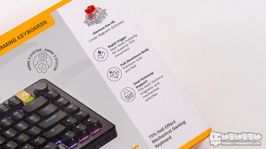 글로리어스 Glorious GMMK 3 PRO HE 75% Prebuilt 키보드 패키지는 제품의 이미지와 래피드 트리거, 풀 알루미늄 하우징, 자석축과 기계식 스위치의 듀얼 핫스왑 지원을 강조하고 있습니다.
