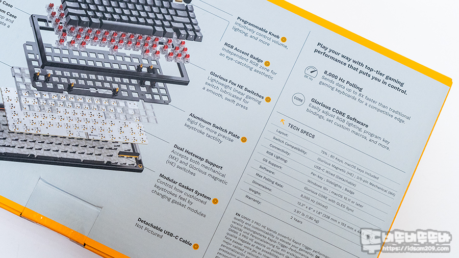 그리고 Glorious GMMK 3 PRO HE 75% 내부에 촘촘하게 구성된 내부 모습, 8K 지원 및 코어 소프트웨어 설명 인쇄를 확인할 수 있습니다.