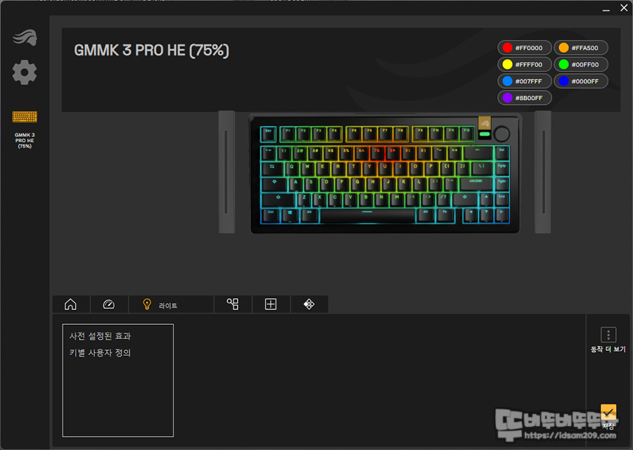 Fn 키와 방향키 조합으로 사용 가능한 RGB LED 효과는 키보드 키를 이용하는 하드웨어 방식과 소프트웨어를 통한 방식이 모두 가능하기에 빠르게 선택할 수 있는 소프트웨어 방식을 추천드립니다.