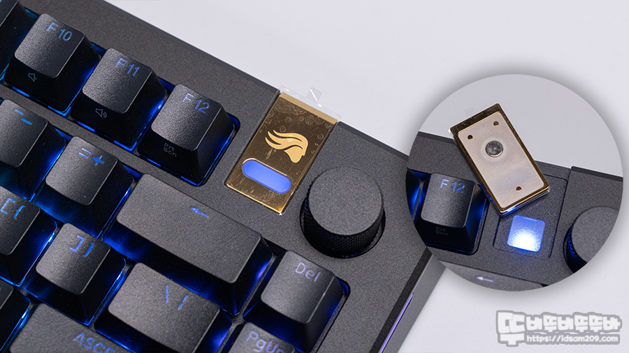 자석으로 탈부착이 가능한 황금색 지에는 LED 표현을 해주는 영역이 있어 키보드의 전반에 걸친 LED 표현과 영역을 나누어 표현하는 부분에 따라 다양한 RGB LED 백라이트 효과를 표현합니다.