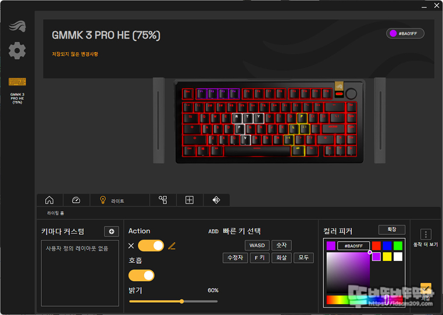 개별 키 설정의 경우 Action 버튼 활성 후 마우스 커서로 키를 선택하여 오른쪽 하단의 팔레트를 이용하여 컬러를 변경이 가능하며 전체 또는 일부 선택 키에 호흡 효과를 추가할 수 있으며 LED 효과를 지우는 방법은 Action 버튼을 비활성화 후 마우스 커서로 선택해 주면 됩니다.
