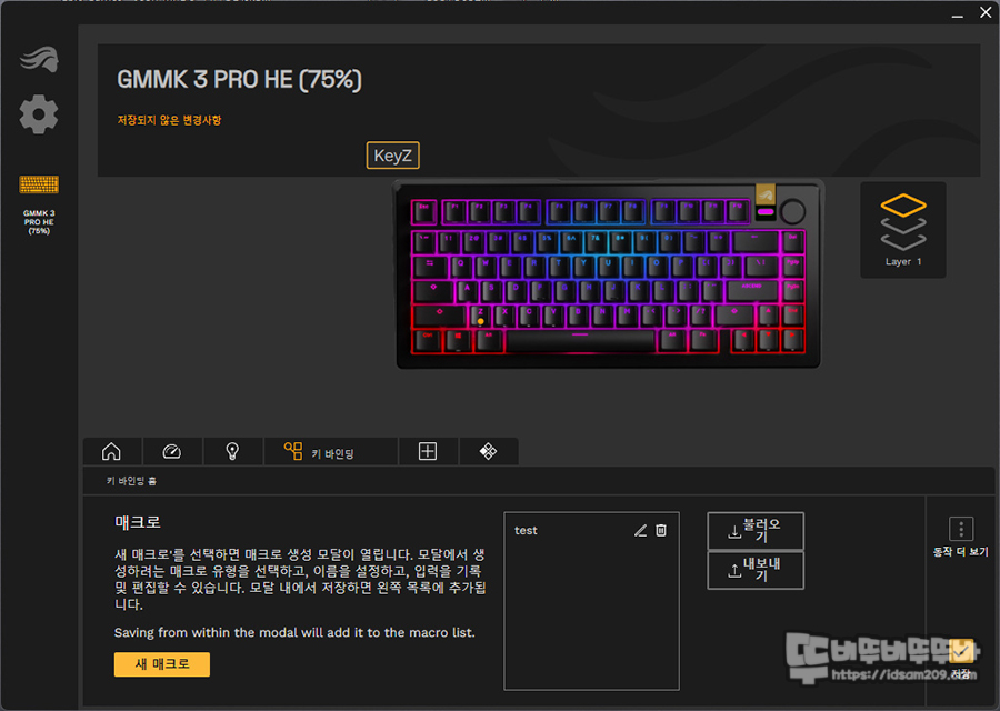 키 바인딩 메뉴에서는 키 기능을 변경하는 키 스트로크, 키보드 기능, 마우스 기능, 매크로 기능, 멀티미디어 기능 등 다양한 설정이 가능한데 키 입력 방식이 아닌 메뉴 선택 방식이라 조금 불편한 편입니다.