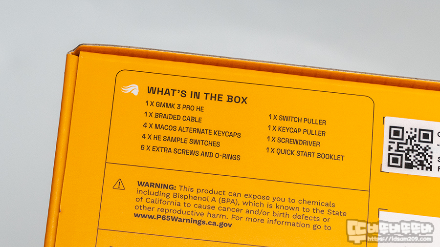 제품은 GMMK 3 Pro HE 본체, 패브릭 소재가 적용된 USB C to A 케이블, Mac OS 모디키, HE 샘플 스위치,