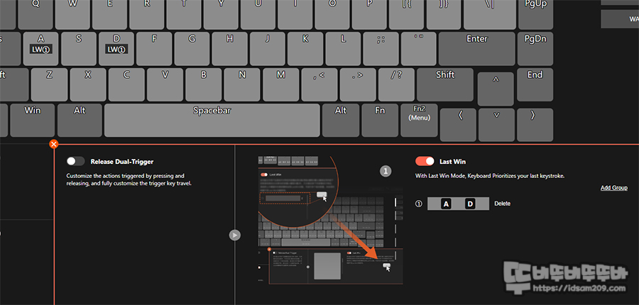 Last Win 기능을 이용하면 aaaaaaddddd 입력 이후에 d키를 떼면 ddddaaaa 형태로 첫 번째 입력이 유지되는 형태로 입력되어 FPS에서 좌우로 이동 시 빠르게 좌우 전환을 지원합니다.