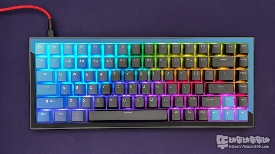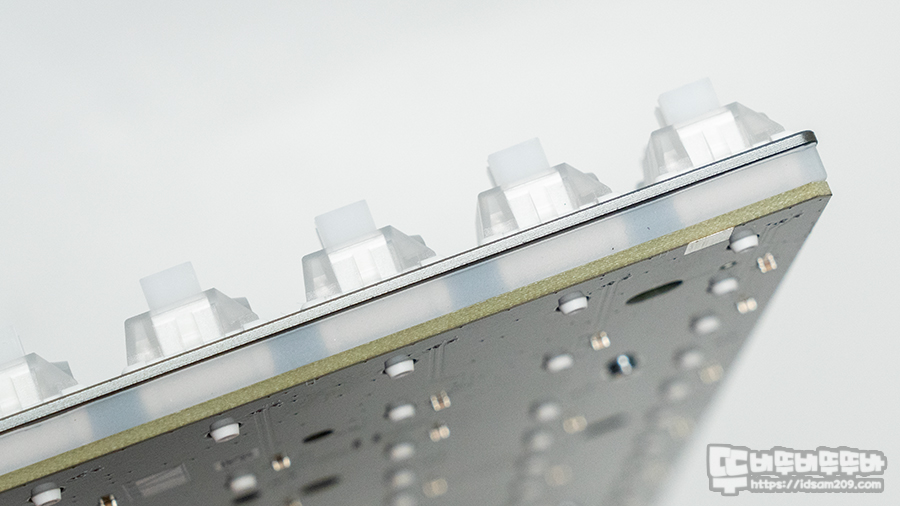 RAESHA사의 자석축이 적용된 DrunkDeer G75는 알루미늄 보강판에 부착되는 보강판용 체리 스빌라이저가 흔들림이 없어 안정적인 타이핑을 지원하며 기판에 SMD 방식으로 부착된 LED 빛이 잘 투과될 수 있게 스위치 투명 뚜껑 부분에는 디퓨저 구조로 디자인되어 LED 백라이트가 타사 제품보다 밝게 표현되는 장점이 있습니다.