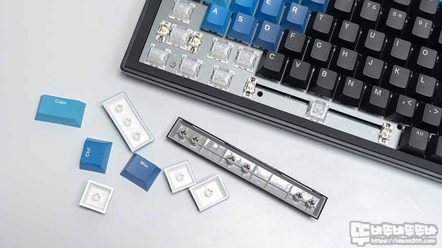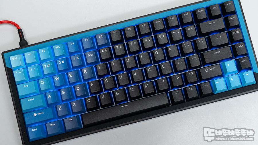 제품에는 PBT 이중 사출 키캡이 적용되었으며 스카이블루, 블루, 인디고블루, 블랙 컬러로 포인트를 주고 있는데요.