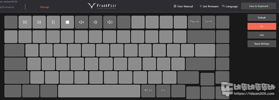 제가 받은 샘플은 오른쪽 Ctrl 기능이 설정이 되어 있지 않아 Fn 레이어를 이용하여 오른쪽 Alt 키를 Fn 조합으로 RCtrl 기능을 추가하여 Fn + RAlt로 오른쪽 Ctrl 기능으로 사용할 수 있도록 설정하였습니다.