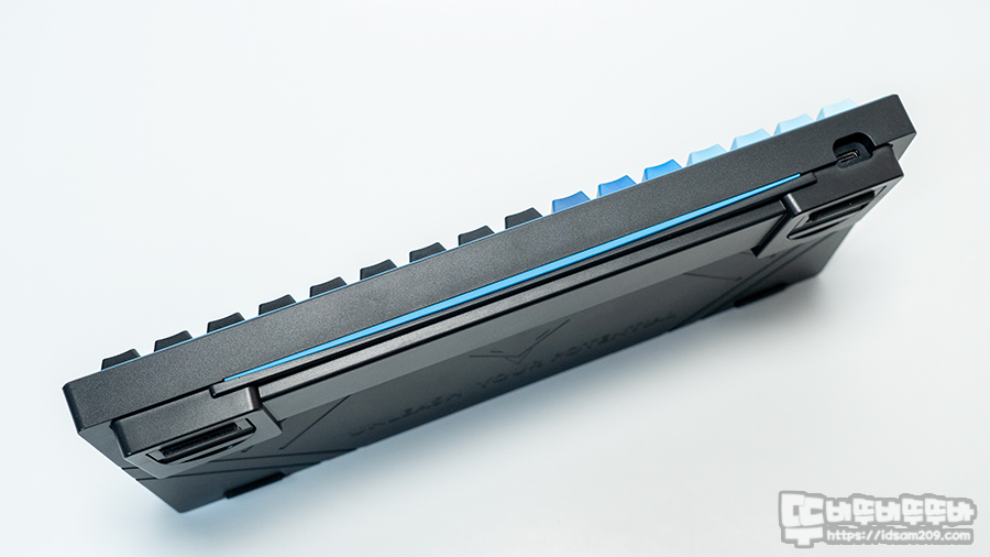키보드 전면부에는 블루 컬러 포인트 부분은 하우징과 높이 조절 파트 사이에 포함된 실리콘 패드로 포인트를 주는 동시에 쿠션감으로 충격을 완화해 주는 역할을 합니다.
