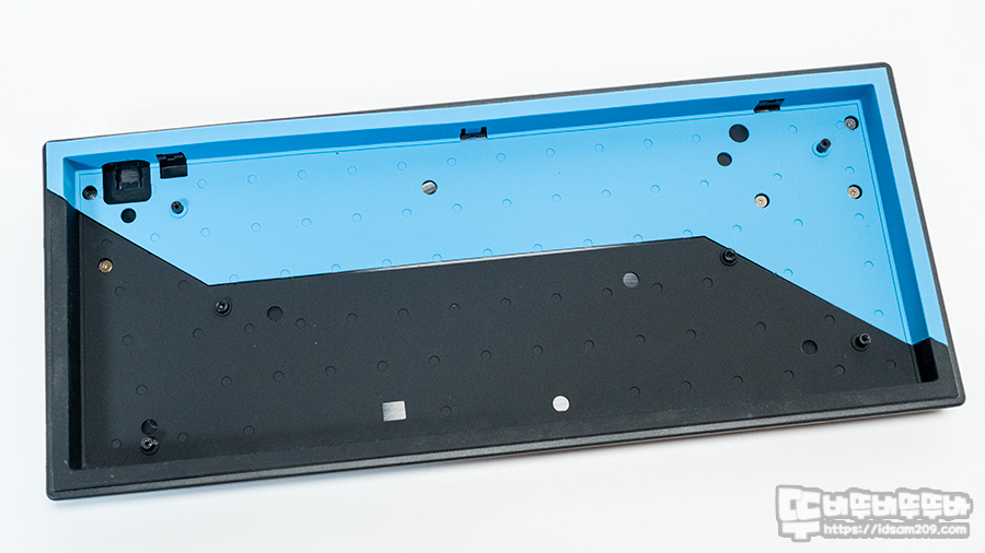 나사를 분리하고 보강판에 결합된 기판 부분을 들어내면 위/아래가 분리되지만 흡사 바구니 느낌으로 디자인된 블루/블랙 컬러 실리콘 흡음재를 확인할 수 있습니다.