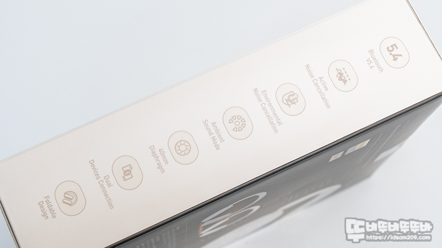 패키지 측면에는 포인트 정보로 블루투스 버전 5.4, 액티브 노이즈 캔슬링(ANC), 환경 노이즈 캔슬링(ENC), 앰비언트 사운드 (주변 소리 듣기), 40mm 드라이버 유닛, 멀티 포인트, 폴더블 디자인 등을 강조하고 있습니다.