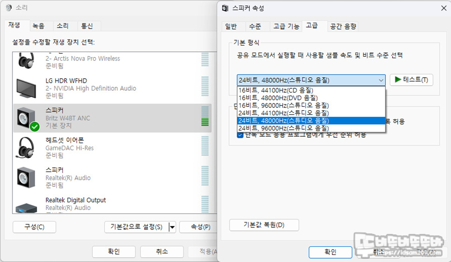 스펙 정보 소개에서 24비트 96kHz 고음질을 지원하는 Hi-Res Audio 규격을 갖추고 있다고 설명드렸는데 PC에 연결하여 유선 헤드폰으로 사용 시 스피커 속성을 이용하여 원하는 샘플 속도와 비트를 선택이 가능하니 잘 활용하세요.